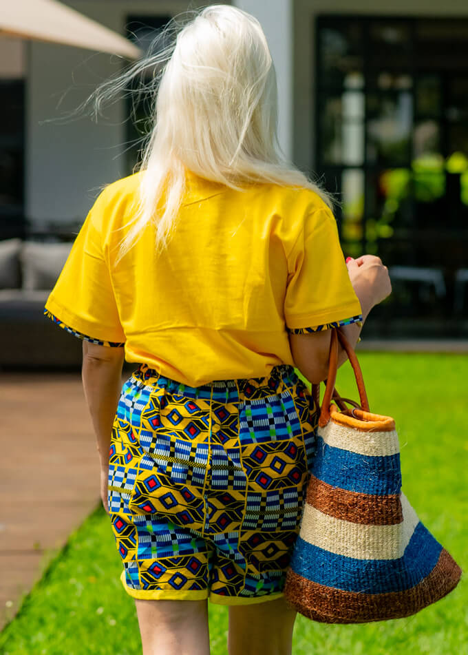 Elevate your wardrobe with stunning cotton T-shirts and shorts, beautifully crafted from vibrant Kitenge fabric.